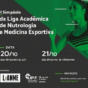 A Faculdade de Medicina da Universidade de Passo Fundo (FM/UPF) realiza, nos dias 20 e 21 de outubro, o I Simpósio da Liga Acadêmica de Nutrologia e Medicina Esportiva (LIANME). O evento, constituído de palestras e mesas-redondas, acontecerá no Auditório Biomédico, Campus II.