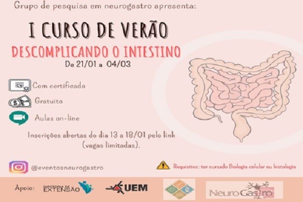 O Grupo de Pesquisa em NeuroGastroenterologia e o Programa de Pós-Graduação em Biociências e Fisiopatologia da Universidade Estadual de Maringá (PBF-UEM) vão realizar, a partir da semana que vem, o 1º Curso de Verão “Descomplicando o Intestino”. As inscrições gratuitas têm vagas limitadas e podem ser feitas entre os dias 13 e 18 de janeiro.